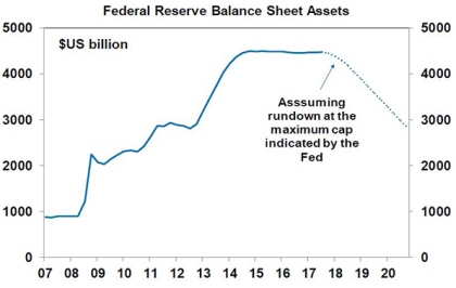 The start to balance sheet reduction – or what is likely to become known as “quantitative tightening” (or QT) – was well flagged earlier this year and the Fed will follow the plan it laid out at its June meeting. The Fed’s balance sheet was boosted by the government bonds and mortgage-backed securities it purchased during its post GFC related quantitative easing programs. It reached around $US4.5 trillion when the Fed ended QE back in October 2014 and has been maintained at this level ever since as the Fed has been reinvesting (or rolling over) bonds as they mature. Going forward, the Fed will reduce its balance sheet not by selling bonds, but by slowing the reinvestment of maturing bonds. This will start at a maximum cap of $US6 billion a month for Treasury bonds and $US4 billion a month for mortgage-backed securities in the December quarter increasing over 12 months until it reaches $US30bn a month for Treasury bonds and $US20 billion a month for mortgage-backed securities in December quarter 2018 at which point it will continue until the balance sheet falls to no more than the level the Fed deems necessary to implement monetary policy (thought to be around $US2-3 trillion). At this rate, the Fed’s balance sheet will have fallen below $US3 trillion by early next decade.