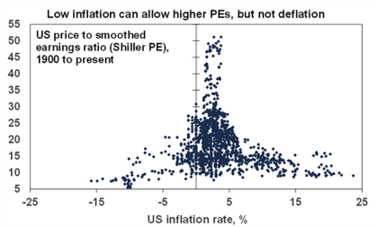 Finally, as can be seen in the next chart, low inflation is generally good for shares as it allows shares to trade on higher price to earnings multiples. But it would be preferable not to see low inflation slip into deflation as this could be bad for shares given it tends to go with poor growth and profits and as a result shares trade on lower PEs. The same would apply to assets like commercial property and infrastructure.