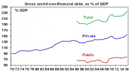 Excessive debt tends to be at the centre of most scare stories regarding the investment outlook – whether they relate to China, public debt in developed countries, corporate debt in the US or Australian household debt. The standard debt related scare story runs something along the lines of “we have lived beyond our means. Any attempt to prevent a debt implosion won’t work or will just delay the inevitable. Divine retribution will get us in the end!” One big debt scare that gets wheeled out is that total global debt outstanding has reached a new record high of nearly $US200 trillion and either that on its own or in combination with any significant rise in global interest rates will trigger the next crisis. To be sure problems with debt or a desire to reduce it are part and parcel of most financial crises and economic downturns. And total global debt has indeed reached record levels. But that’s not the same as saying another financial crisis is imminent. This note looks at the main issues.